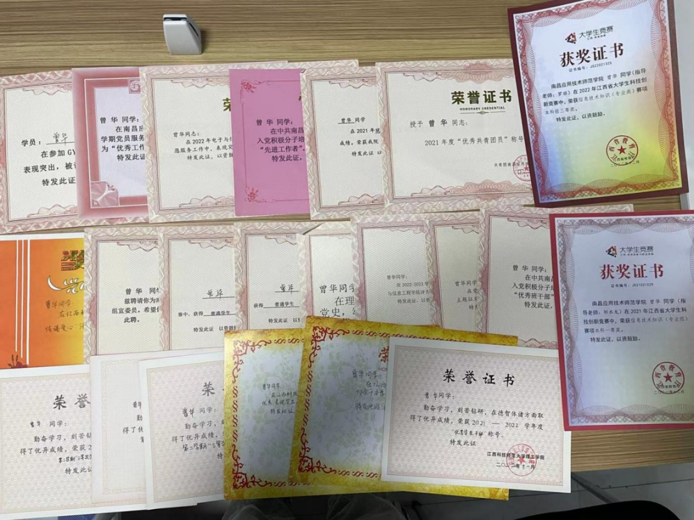 在专业学习中,曾华刻苦钻研、勤学善问、勇攀高峰,多次获得校奖学金;曾华积极参加各类学科竞赛,提升专业素养。在校考取了高中数学教师资格证。大学四年学业成绩综合排名年级前十,系统学习计算机专业相关知识。在这期间获得了“优秀共青团员”荣誉称号、“最美大学生”、党校“优秀工作者”、“优秀志愿者”、就业创业知识竞赛“一等奖”,多次在江西省大学生科技创新与职业技能竞赛中获得“信息技术知识本科组”中获奖。
