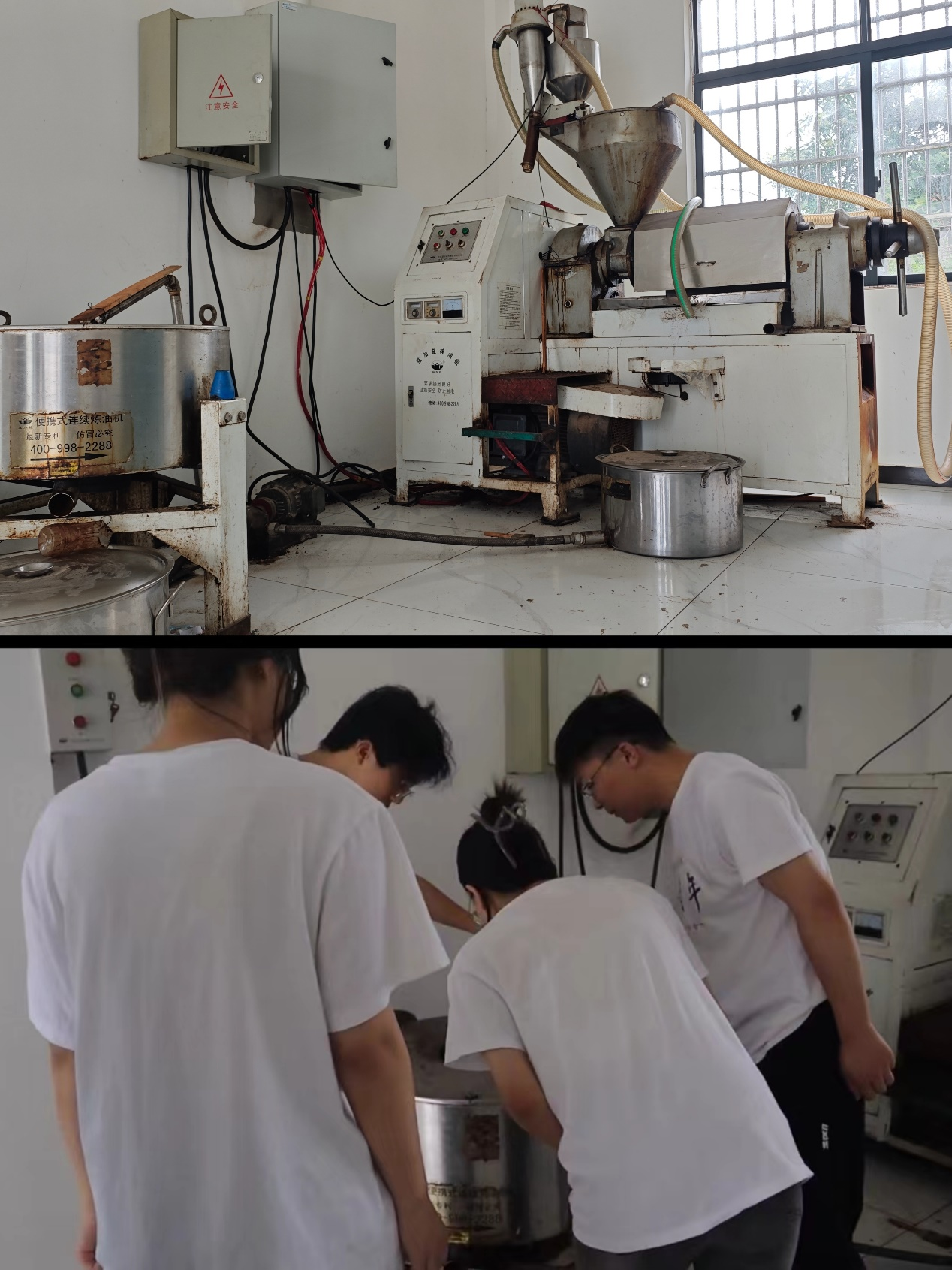 "扶苏之翼"实践队在官场村村干部的悉心引领下我们一同来到了榨油工作室区域。一进入榨油工作坊,就看到食用油精炼机,榨油机等机器,据工作人员介绍,榨油制作工艺大致分为预处理,蒸炒,压榨,过滤,精炼,储存,包装,运输而这八道工序,每一道都有讲究,每个小小的细节都影响着油的质量和口感。