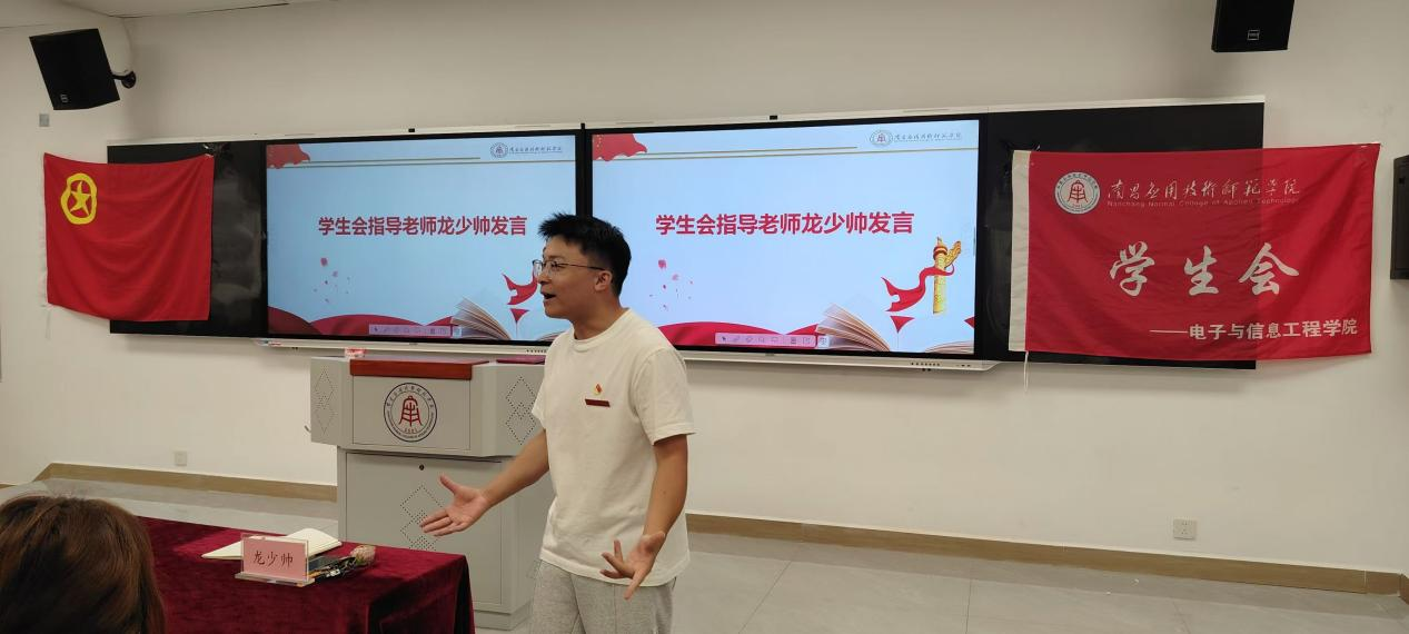 最后学生会龙少帅对各位学生会成员的期许要求以及未来一年的学生会的奋斗目标。希望他们以饱满的热情、高度的责任感投入学生会工作中,并希望现任的主席和部长们能甘做领头鹰、打好铺石路。