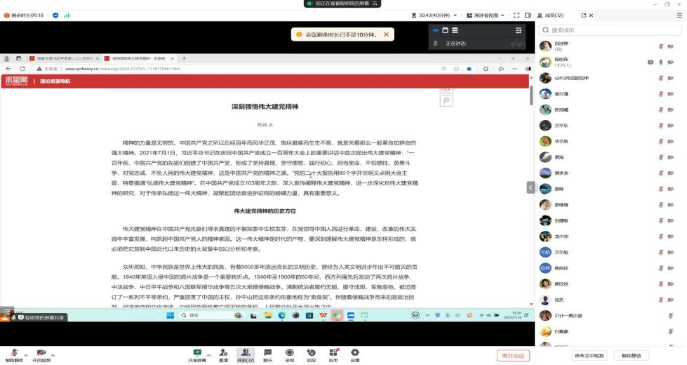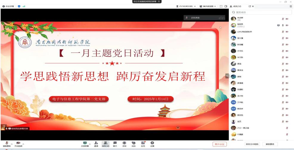 为持续深入学习贯彻习近平新时代中国特色社会主义思想,弘扬伟大建党精神,使全体党员更加自觉地学习党章、遵守党章、贯彻党章、维护党章,威廉体育williamhill第二党支部于2025年1月14日,在腾讯会议组织召开了“学思践悟新思想 踔厉奋发启新程”主题党日活动。支部全体党员参加了此次会议,会议由党支部书记程明珠主持。