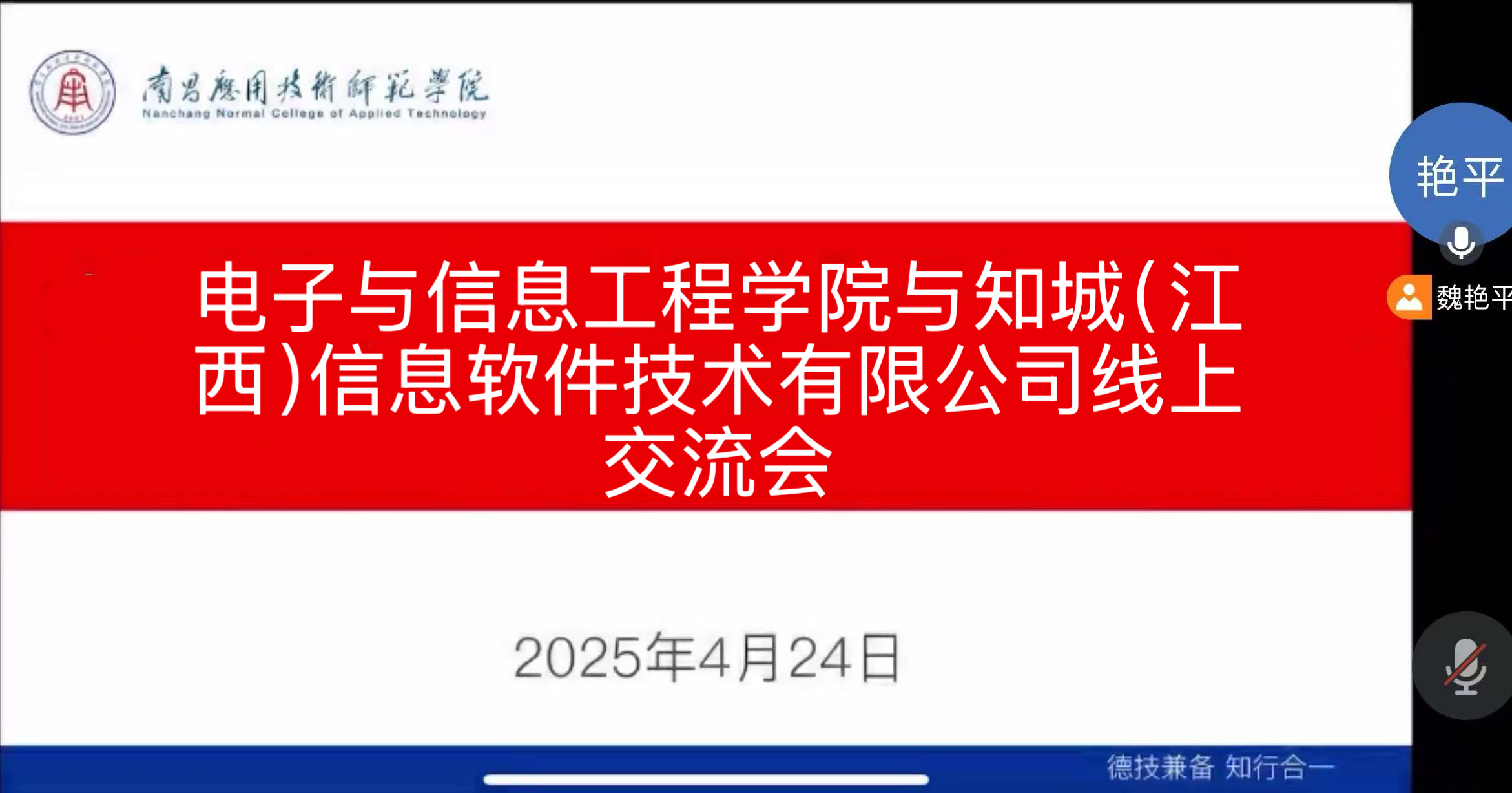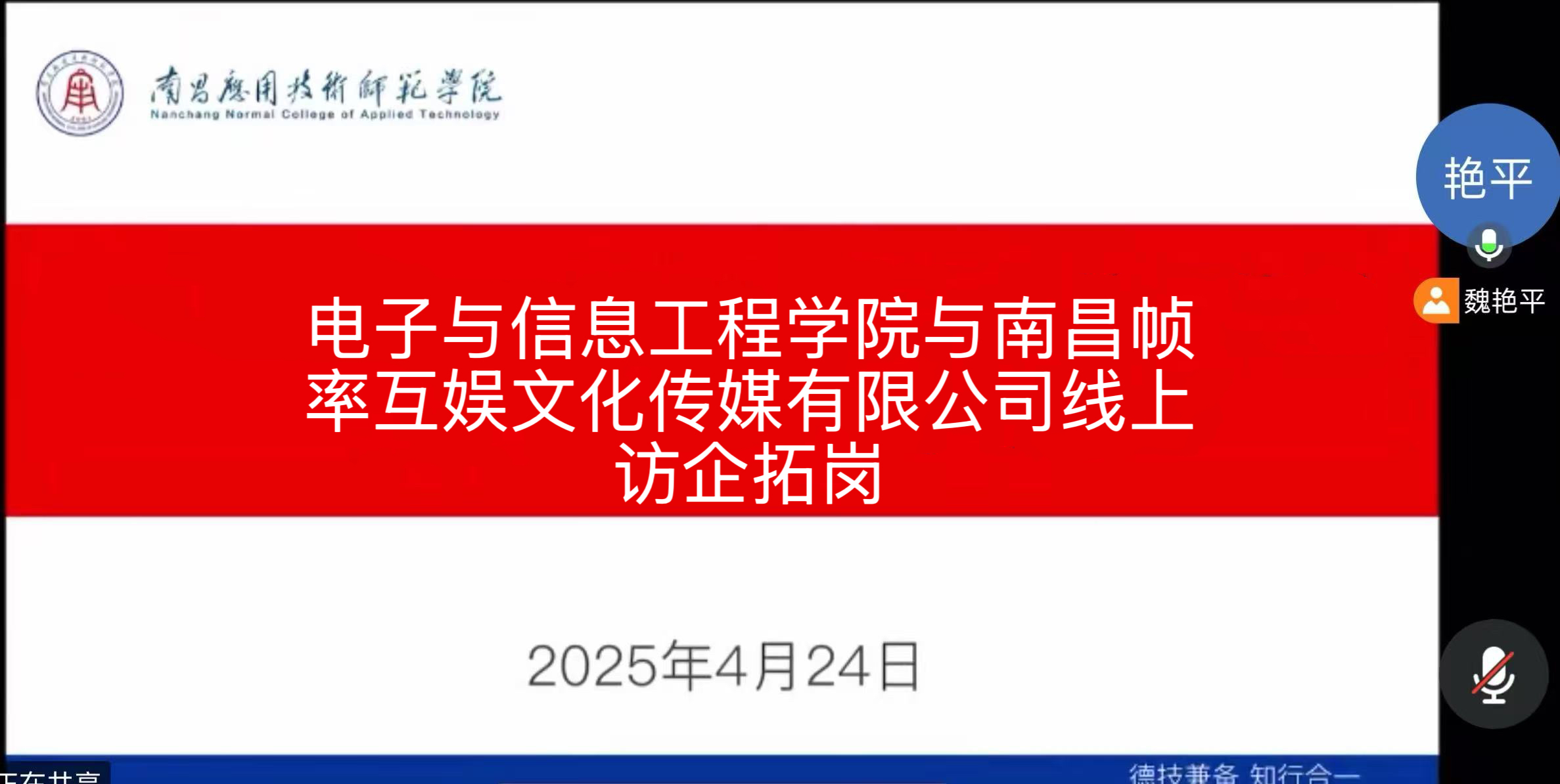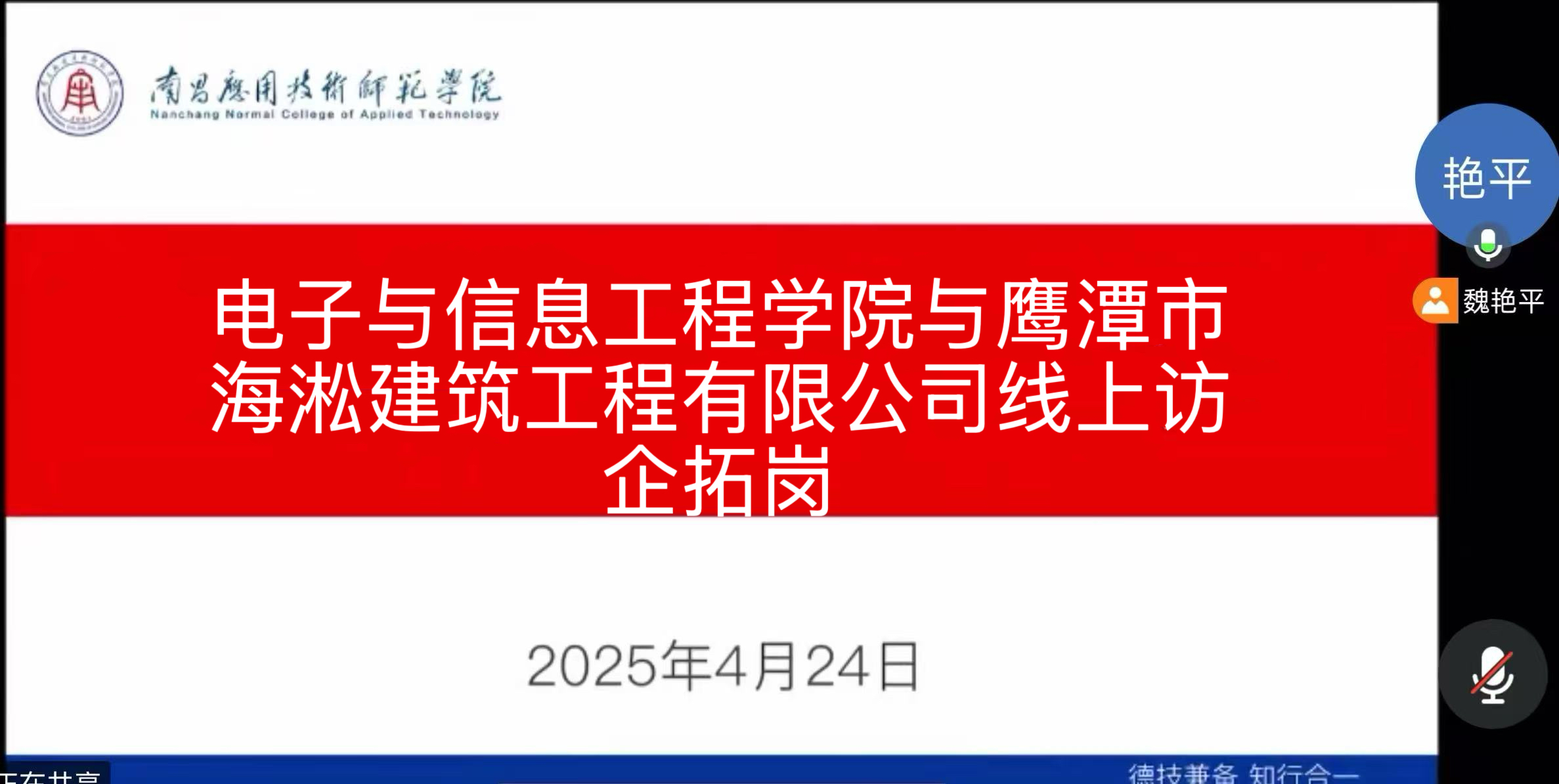 为深入贯彻落实教育部2025届全国高校毕业生春季学期就业重点工作推进视频会议部署要求,抢抓春季促就业攻坚期,深化校企合作,拓宽就业渠道,助力毕业生高质量就业,4月24日,威廉希尔官网魏艳平院长通过线上腾讯会议与鹰潭市海淞建筑工程有限公司、江西山谊科技有限公司、南昌帧率互娱文化传媒有限公司、知城(江西)信息软件技术有限公司进行深入交流。