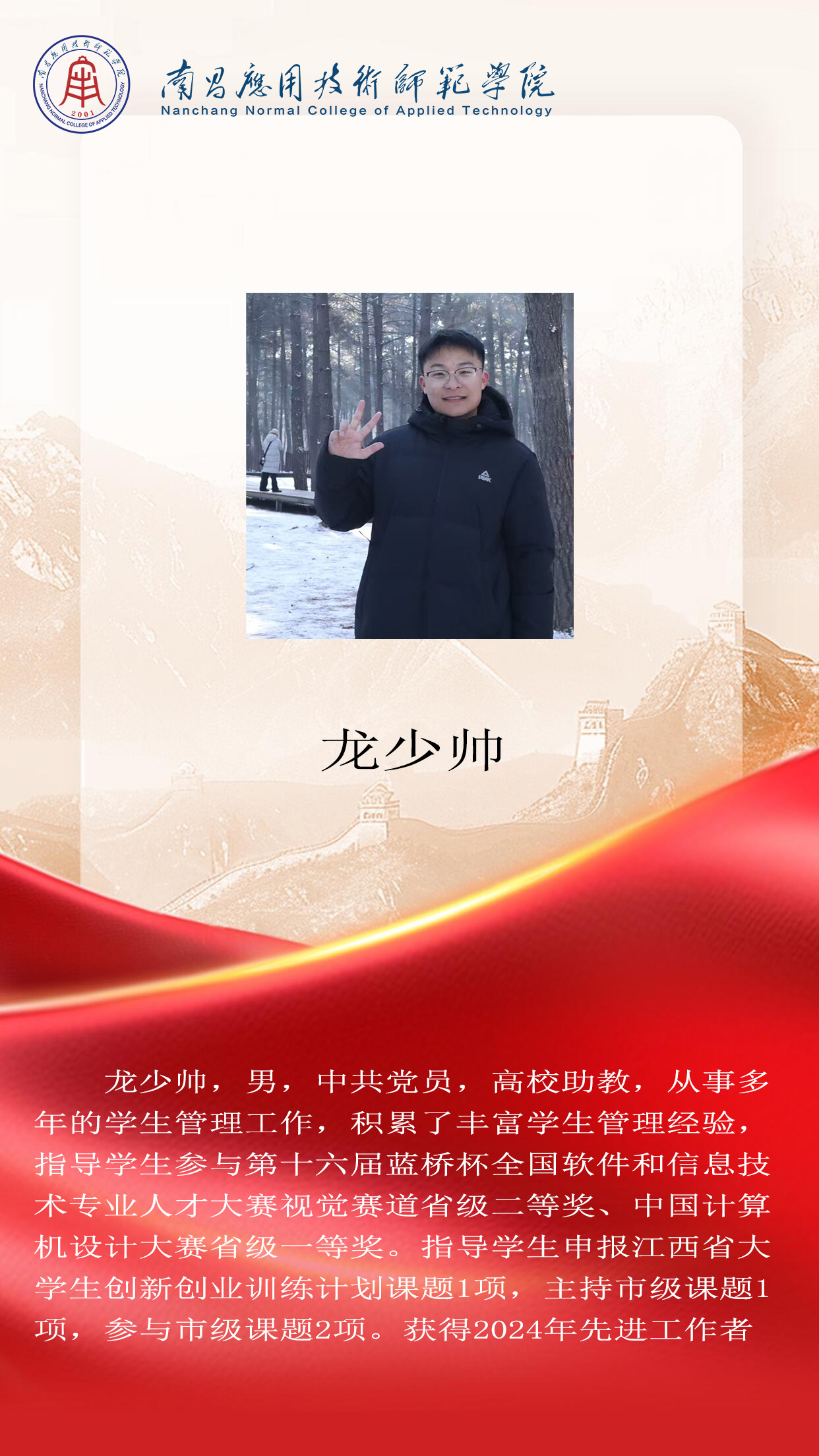 先进典型 优秀毕业生 优秀学生风采 优秀教职工 您现在的位置是:首页 > 先进典型 > 优秀教职工 龙少帅 先进工作者 管理员2025-06-161335 上一篇 刘硕 数字媒体系主任 下一篇 张扬 工程技术系主任