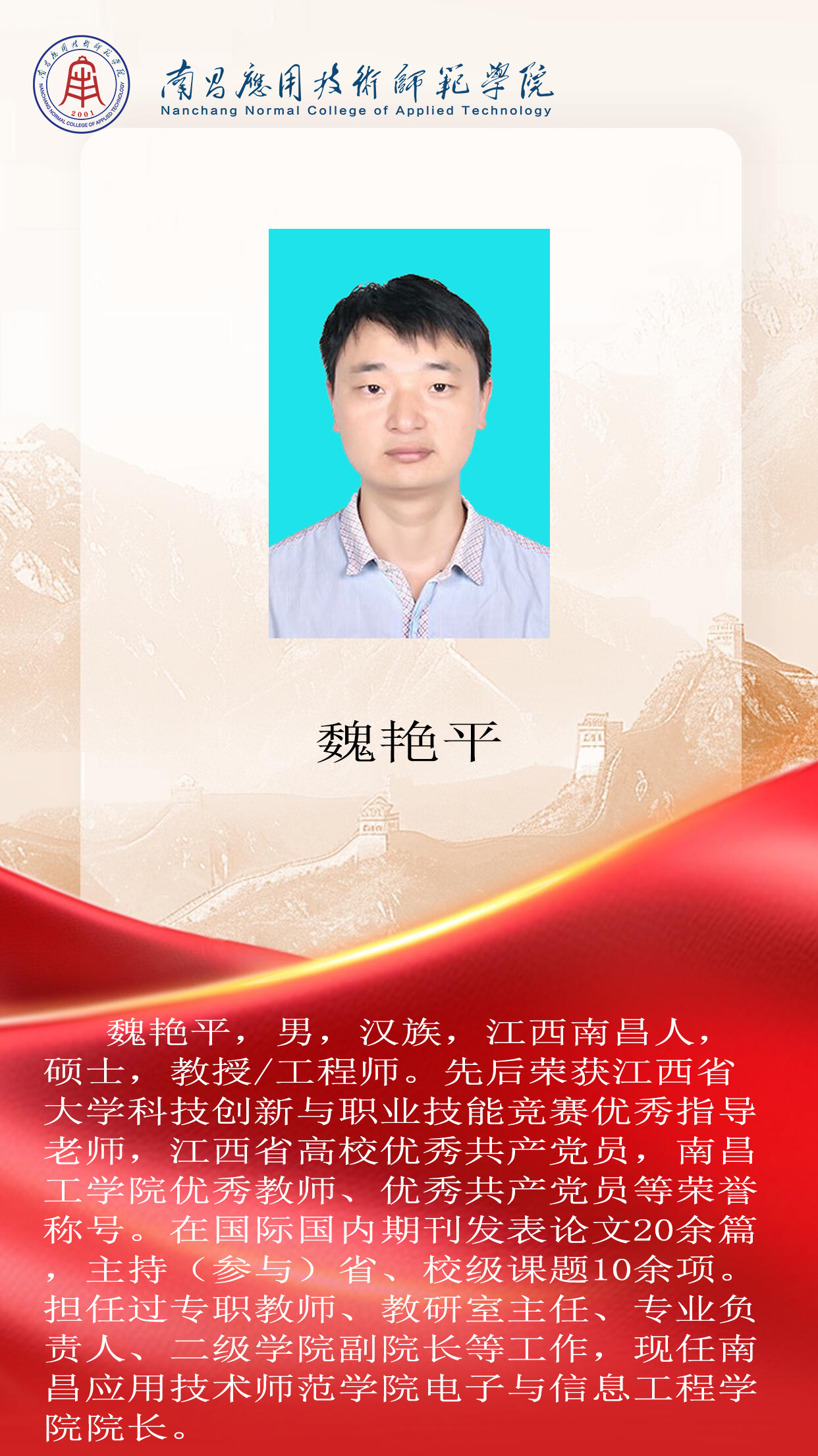 先进典型 优秀毕业生 优秀学生风采 优秀教职工 您现在的位置是:首页 > 先进典型 > 优秀教职工 魏艳平 教授 管理员2025-06-161241 上一篇 宋端 最美辅导员 下一篇 张扬 工程技术系主任