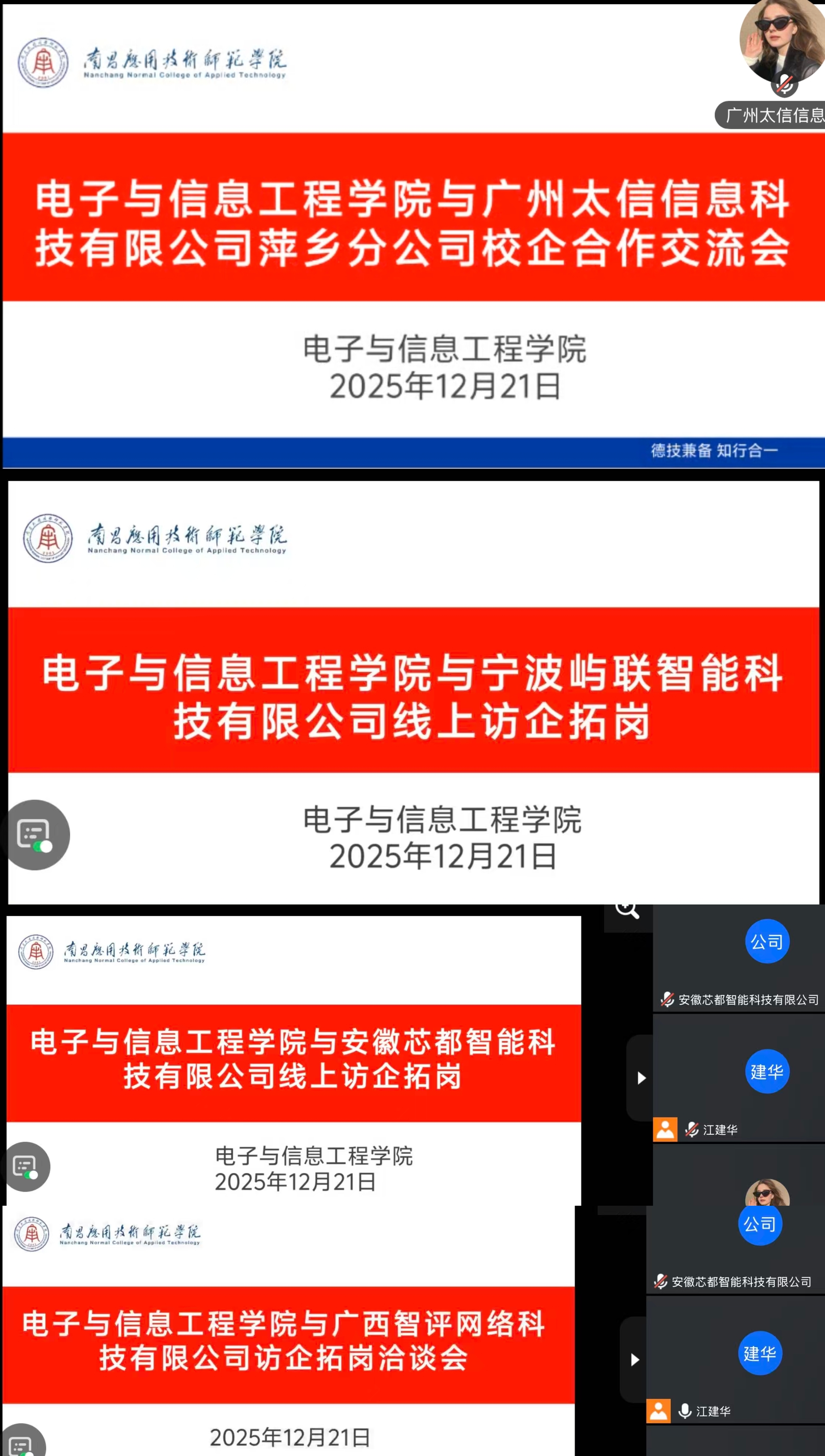 为深入贯彻落实党中央、国务院关于高校毕业生就业工作的决策部署,精准对接行业需求,拓宽毕业生就业渠道,12月21日,威廉体育williamhill组织开展线上访企拓岗专项行动。校长助理李少义、学院党总支书记江建华先后与广州太信信息科技有限公司萍乡分公司、宁波屿联智能科技有限公司、安徽芯都智能科技有限公司、广西智评网络科技有限公司、南昌久鼎教育咨询有限公司、江西铝艺兴实业有限公司、咪谷人工智能科技(杭州)有限公司等7家行业头部企业、重点用人单位进行线上座谈交流,深化产教融合、校企合作,为毕业生高质量就业注入强劲动力。