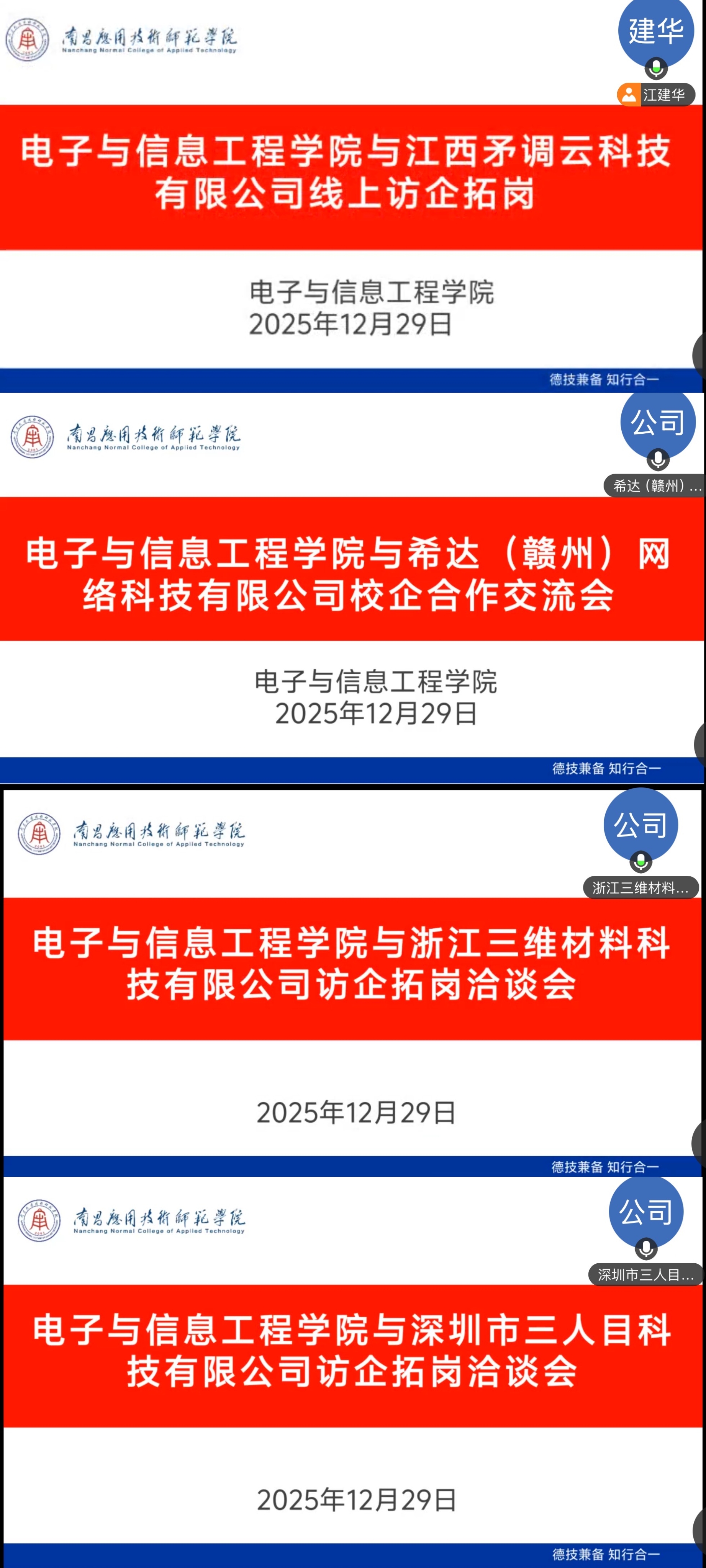 12月29日,为抢抓就业关键期,精准匹配行业人才需求,全力推进学院毕业生就业工作,威廉体育williamhill以线上视频会议形式集中开展访企拓岗专项活动。学院党总支书记江建华、党总支副书记黄金标、就业专员曾思雨共同参与,与希达(赣州)网络科技有限公司、杭州陆汇智能科技有限公司、江西矛调云科技有限公司、江西优优合纵网络科技有限公司、浙江三维材料科技有限公司、江西汇康实业有限公司、深圳市三人目科技有限公司等7家行业标杆企业负责人进行深度洽谈,旨在深化校企合作内涵,拓宽毕业生就业路径,实现人才培养与产业需求的同频共振。