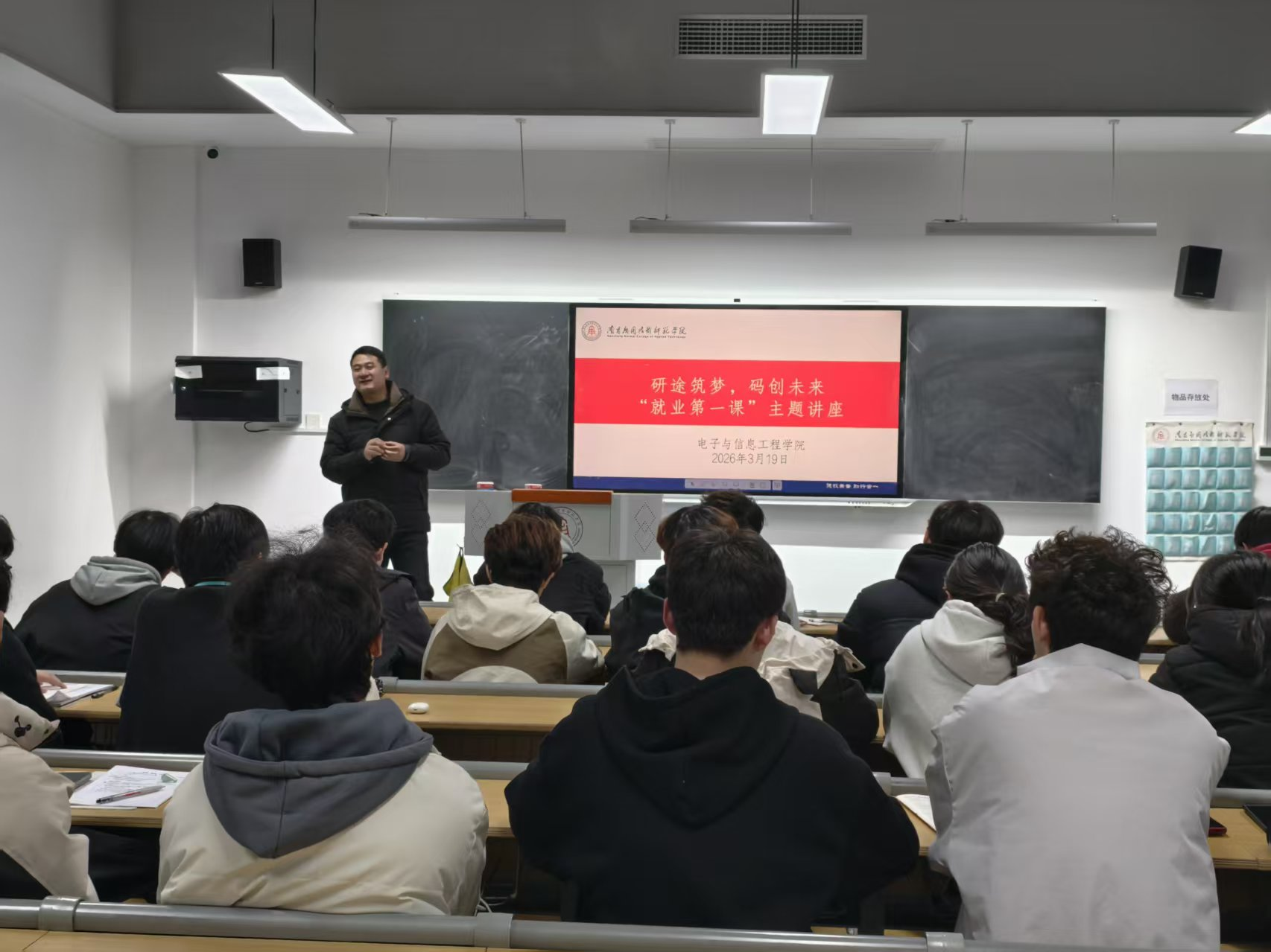 为切实提升学生职业规划意识与就业竞争力,引导学子精准把握数字时代行业发展机遇,科学规划学业与职业发展道路,3月19日晚,威廉希尔官网在沁苑二教B座教室举办了以“研途筑梦,码创未来”为主题的就业第一课专题讲座,本次讲座由学院党总支书记江建华担任主讲,全体辅导员及2025级软件工程专业学生参加。